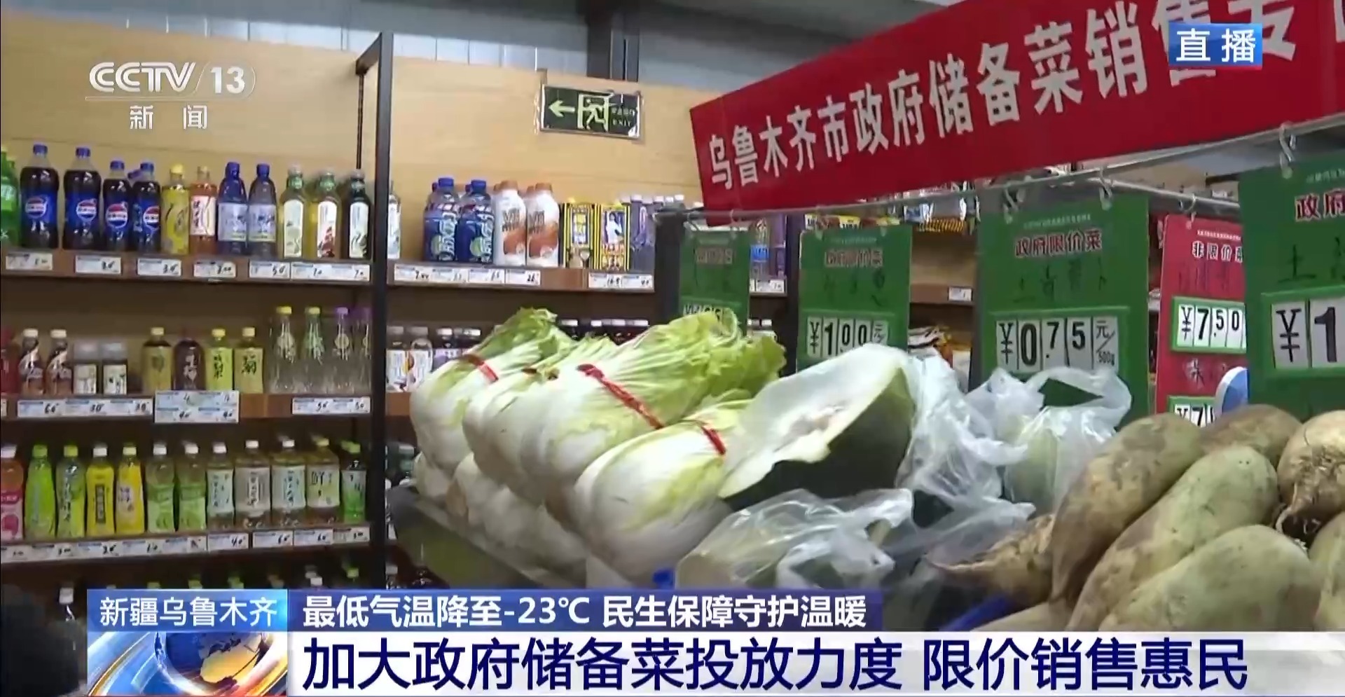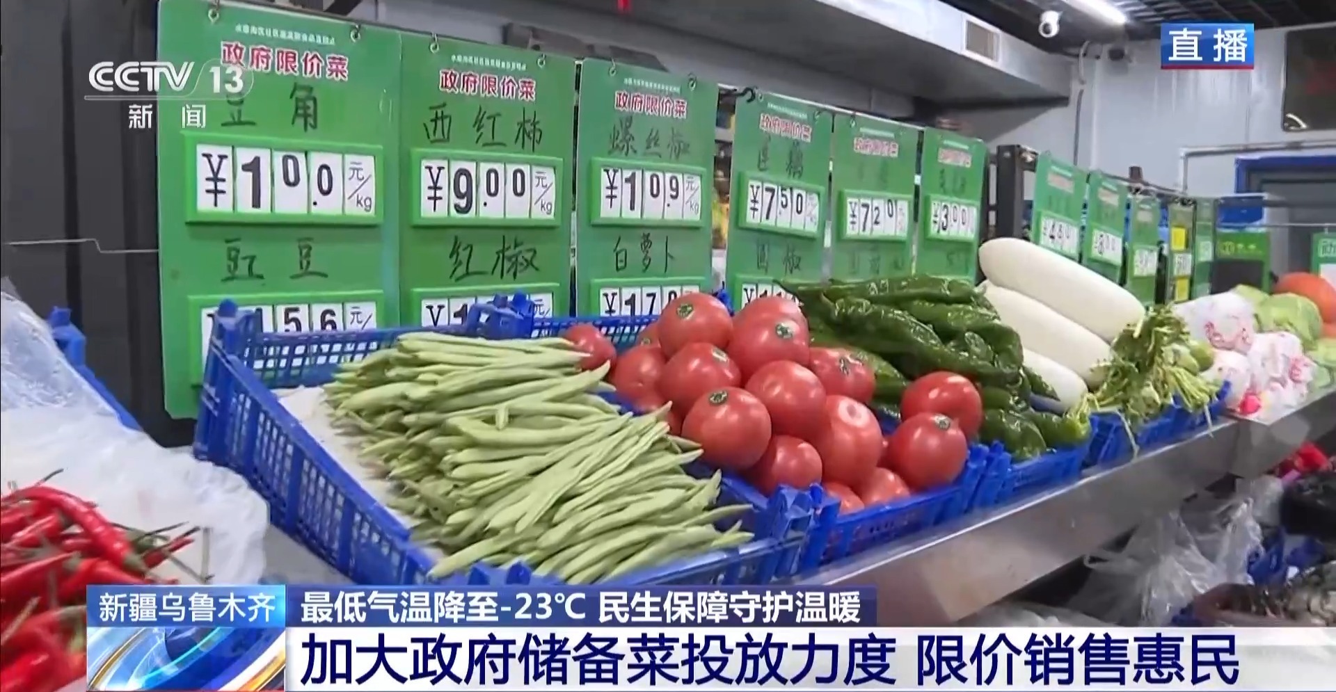 从1月15日开始,新疆出现了新一轮寒潮天气,乌鲁木齐的气温大幅下跌,今天城区最低气温跌至-23℃。当地加大政府储备菜的投放力度,确保群众“菜篮子”里的民生温度。